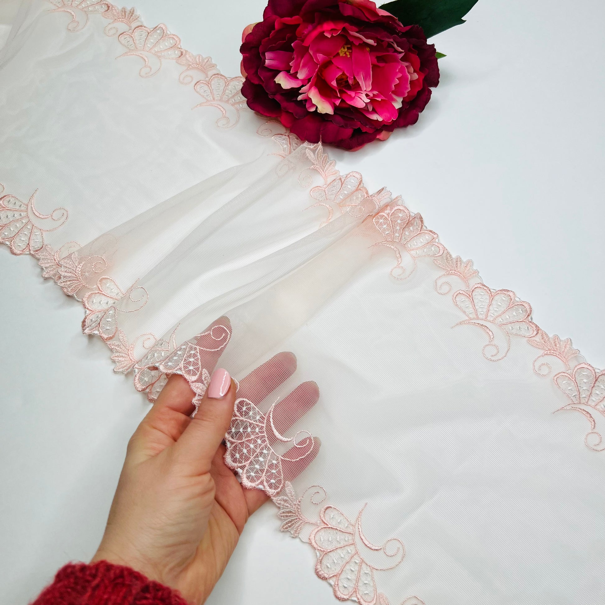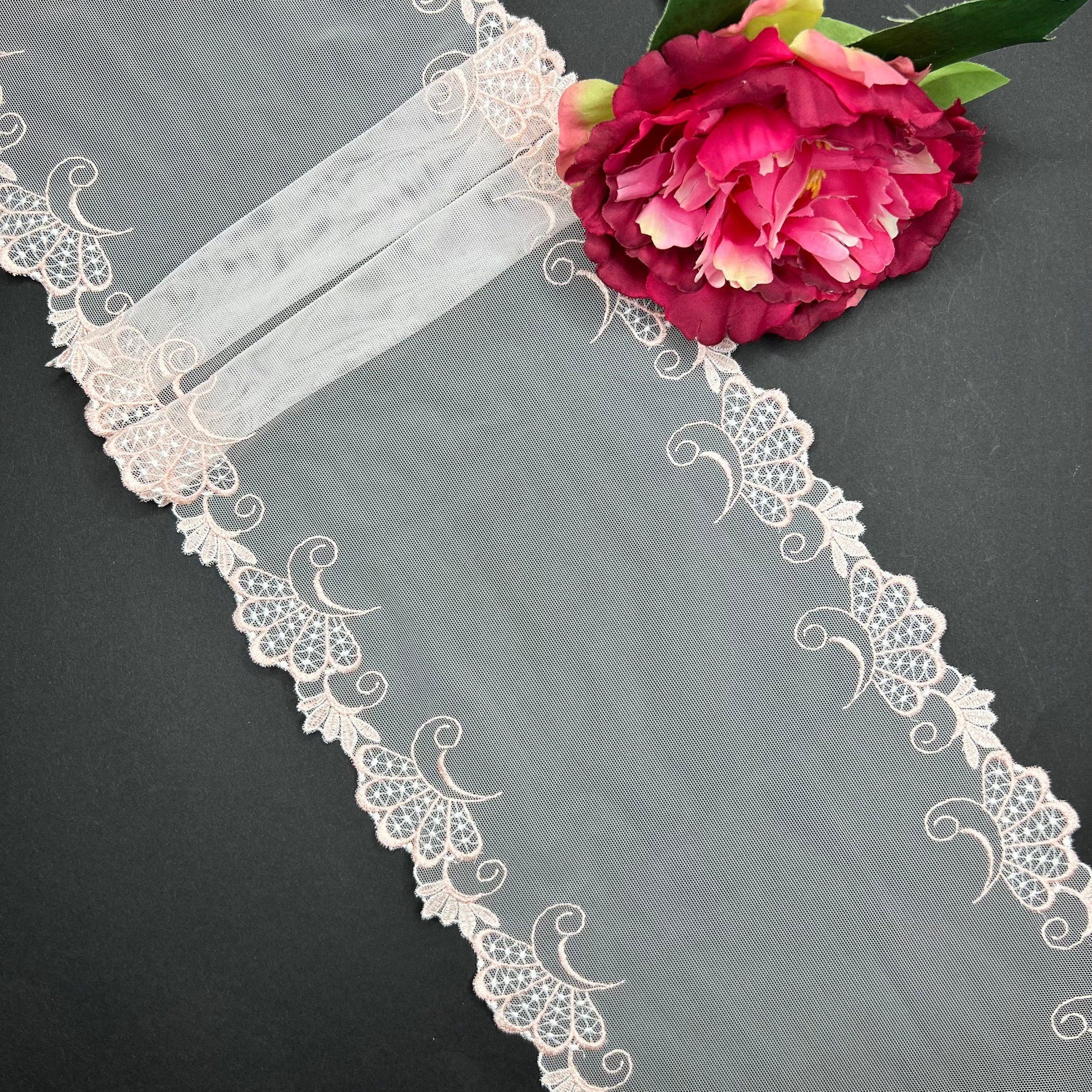 1 m de encaje bordado elástico fino en rosa melocotón. Encaje por metro.