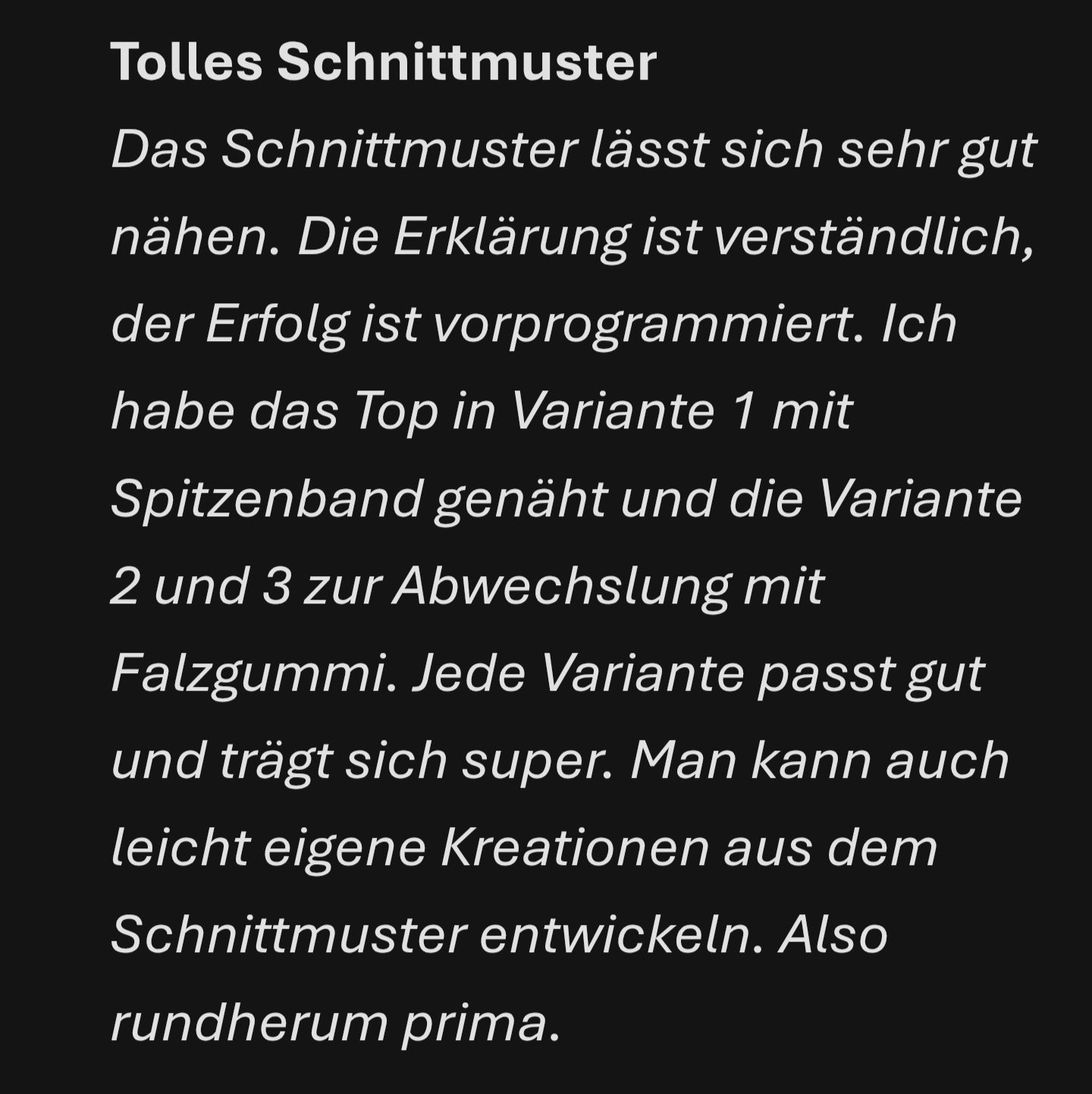 Consommation de tissu : La consommation de tissu dépend du design. Pour le haut, vous aurez besoin d'environ 50 cm de tissu, d'une largeur standard de 140 cm. Vous trouverez tous les détails dans le livre numérique.